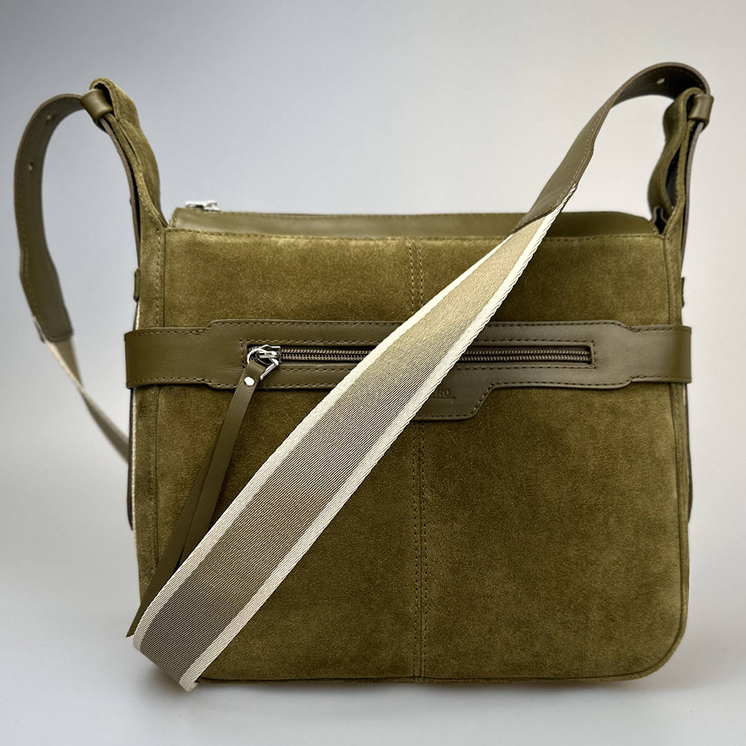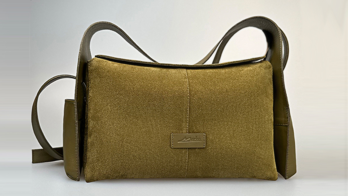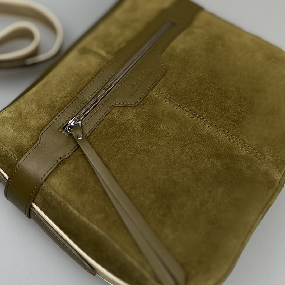 Спилок-велюр - это невероятно тактильный и визуально теплый материал. В приглушенном оливковом оттенке он напоминает о мшистых лесных тропинках и начале осени, когда деревья только готовятся к смене убранства. Сумки из спилка-велюра, будь то мягкие или полужесткие модели, добавляют образу уютной объемности и скульптурности.