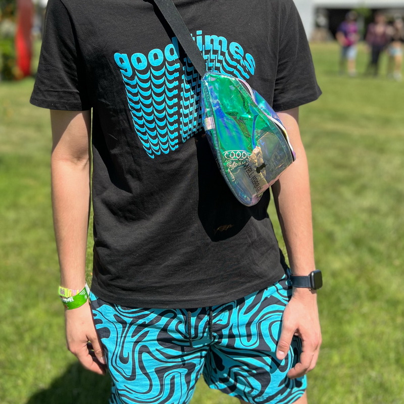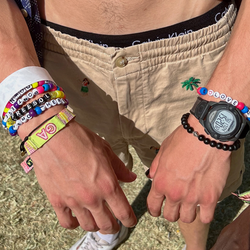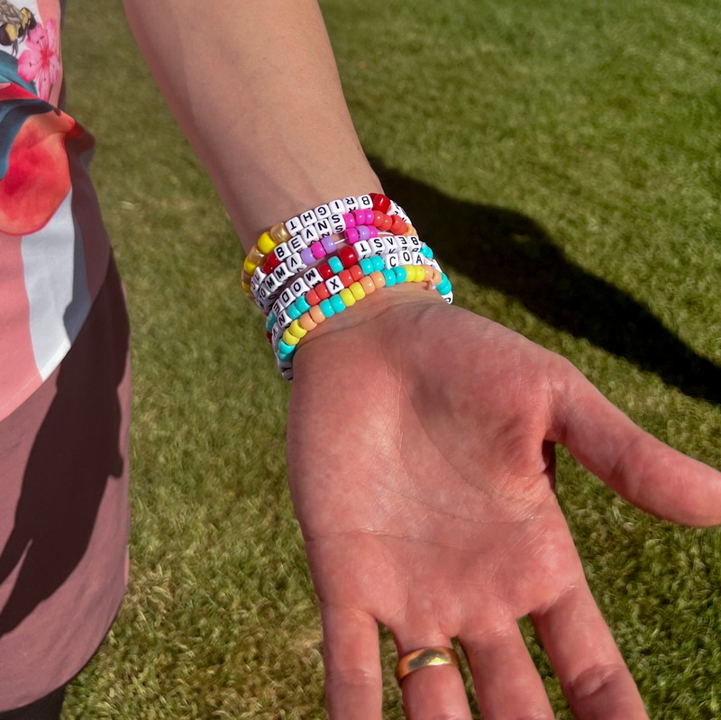 Выберите свои любимые и красочные шармы с лозунгами для индивидуального подхода. Можно добавить мотивы грибов и 2000 года, чтобы придать оттенок психоделического лета, создать контрастную и яркую насыщенность. Бусы из переработанного пластика.